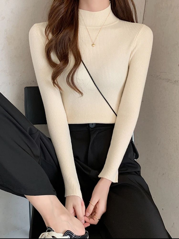 Autumn Winter Mock Neck Women Sweater Vintage Basic Solid Knitted Tops Casual Slim Pullover Korean Sweaters Simple Chic Jumpers